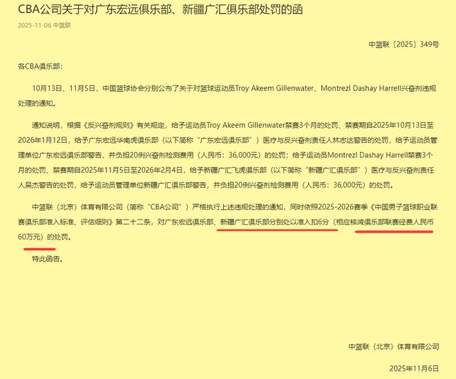 重拳出击!继中国篮协对广东宏远队和新疆队外援兴奋剂违规做出处罚之后,CBA也及时进行追加处罚:准入扣6分+60万元的罚款,球迷拍手叫好!